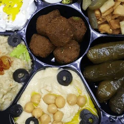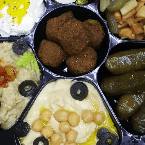 Hummus, baba ghanouj, labaneh (3), falafe (2), kibbe (3), and grape leaves