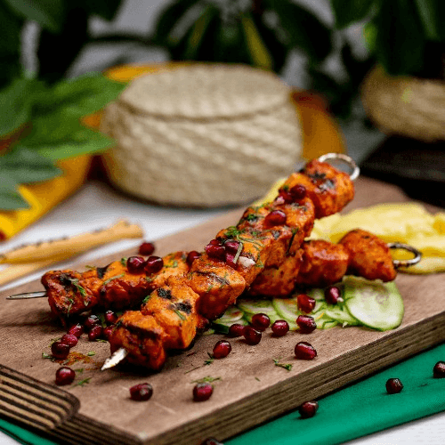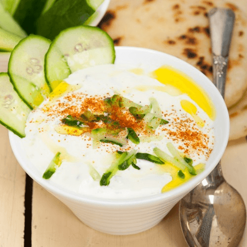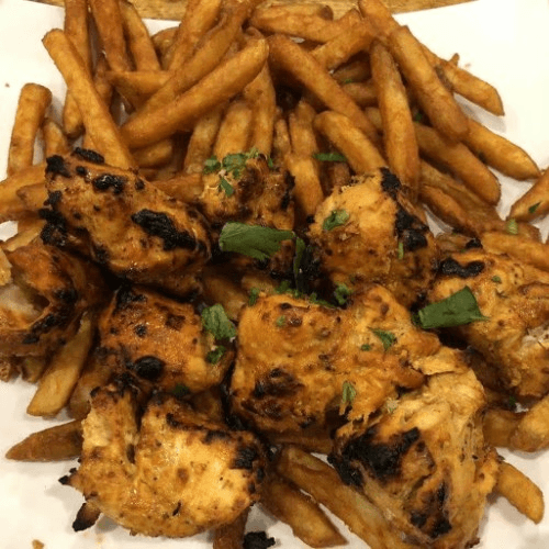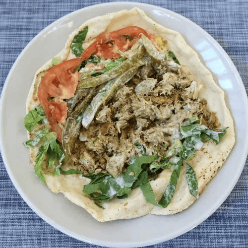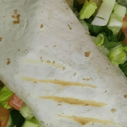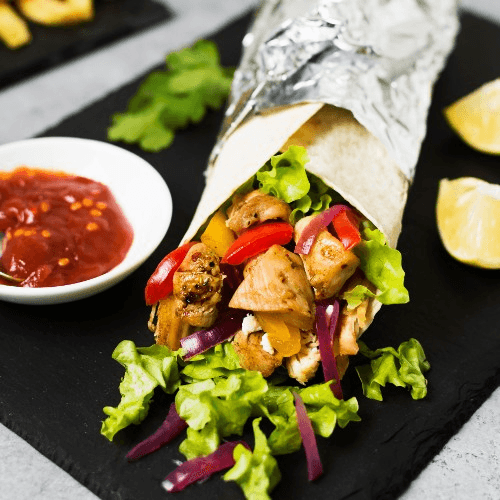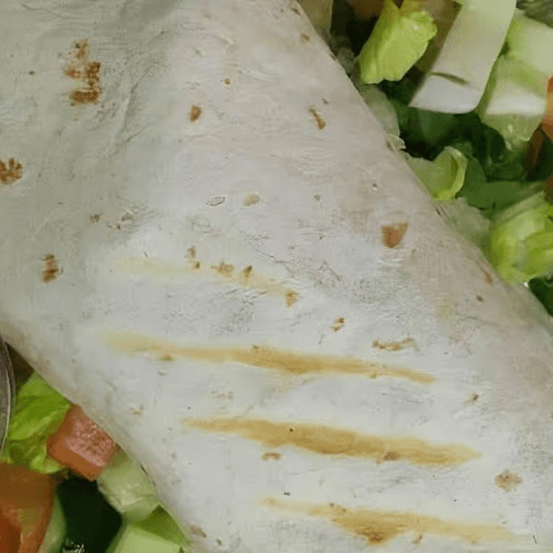 Tender grilled skewered chicken cubes. Include tomatoes, lettuce, onions, pickles, and tzatziki sauce rolled in a pita