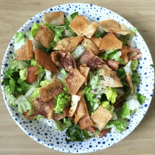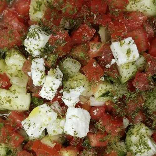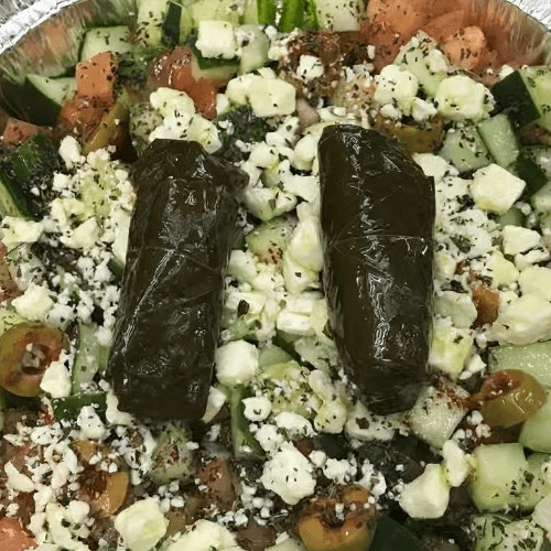 Romaine lettuce, tomatoes, cucumber, black olives, feta and stuffed grape leaves with olive oil, lemon juice, and spices