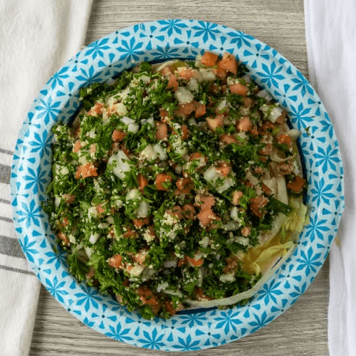 Vegetarian salad of finely chopped parsley, tomatoes, onion, bulgur, with a light drizzle of lemon juice, oil, and spices