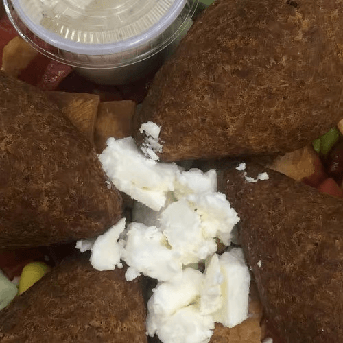 Vegetarian. Small comes with six over salad, large comes with 12 over salad