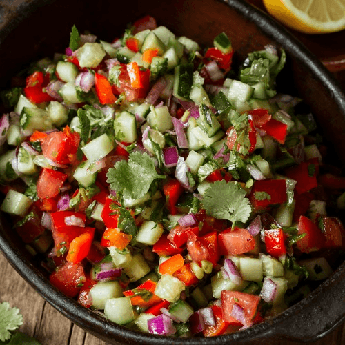 Chopped cucumbers, tomatoes, parsley, lemon juice, oil, and spices